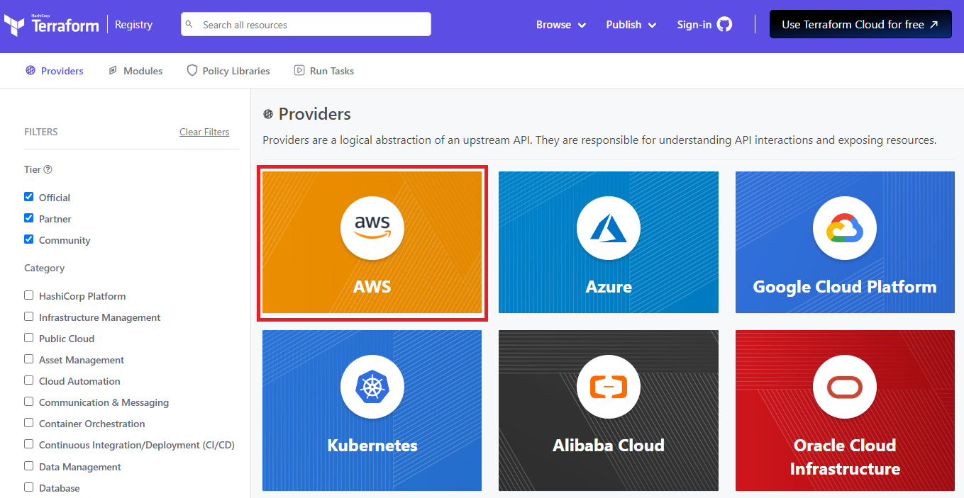 가장 먼저 [그림 1]의 Terraform 코드를 작성해야 하는데, 가장 참고하기 좋은 문서는 Terraform docs입니다. 들어가면 먼저 어떤 provider를 사용하는지를 선택하는데, 본인 환경에 맞는 provider를 선택하면 됩니다. 여기서는 aws를 예제로 사용할 것이기 때문에 aws를 선택하였습니다.