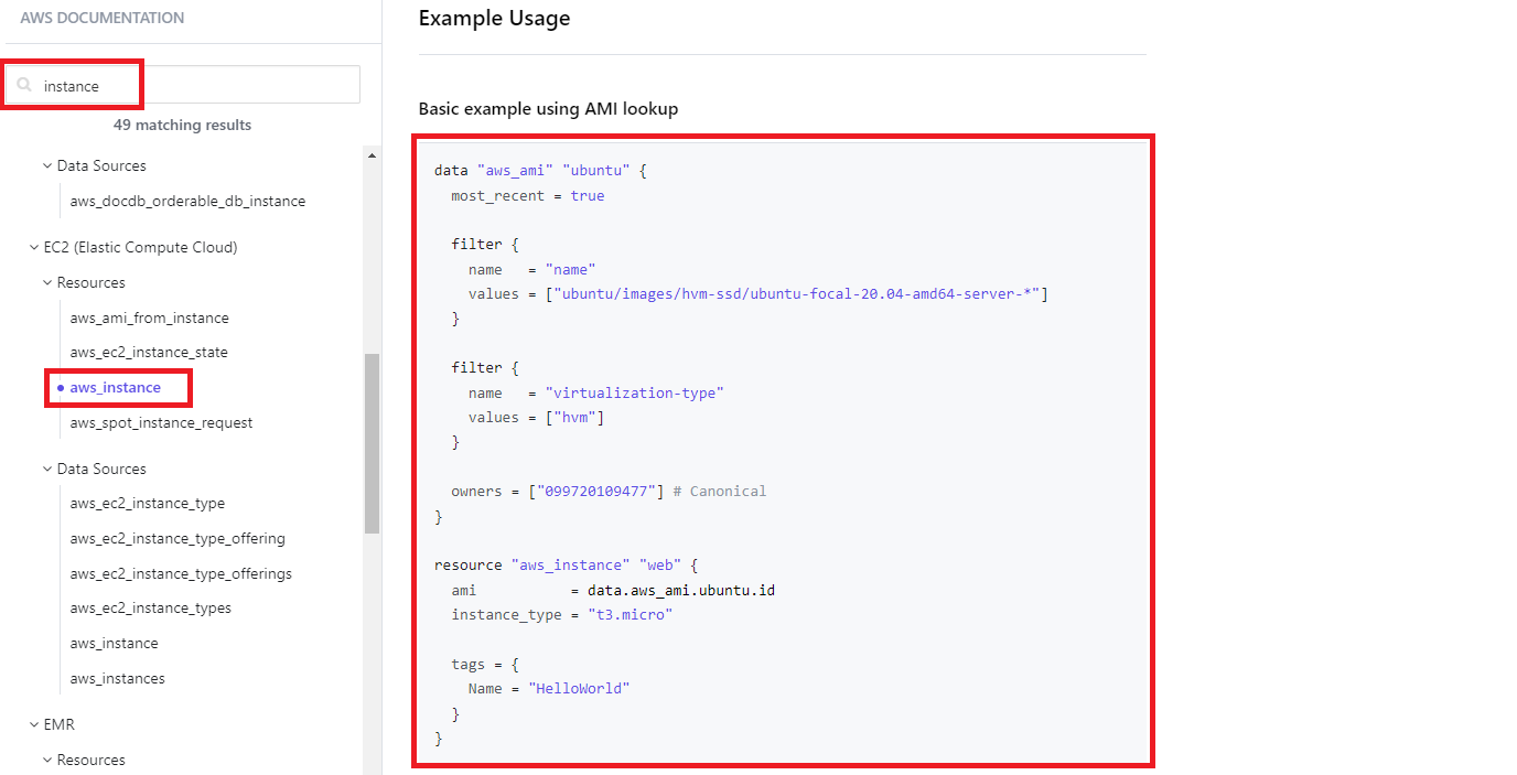 [그림 3] Terraform docs에서 instance 생성 예제 검색