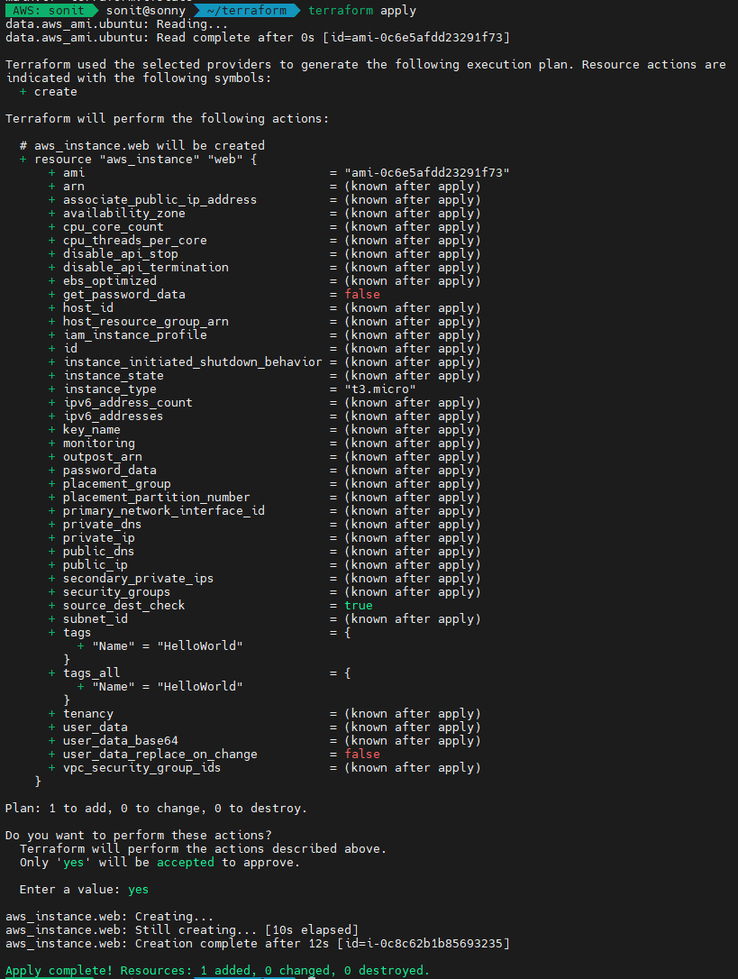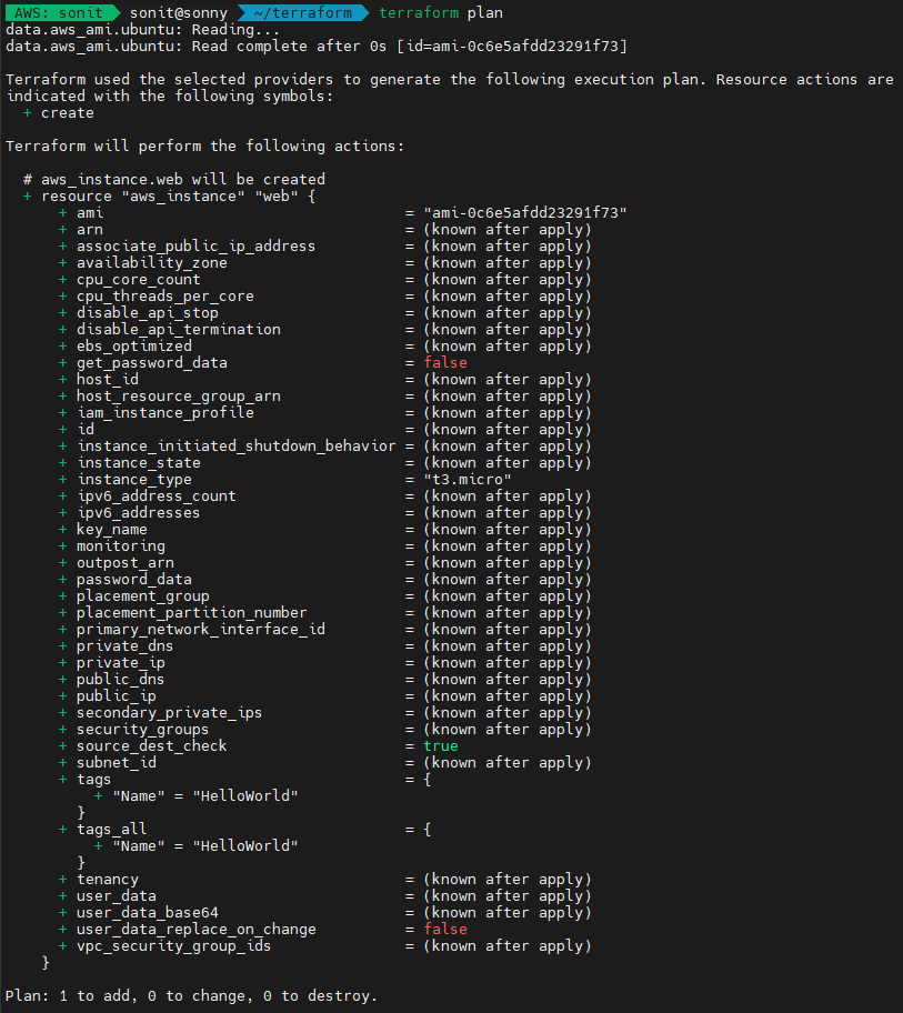 terraform plan 명령을 수행하면 인프라에 어떻게 반영될지에 대한 결과를 미리 확인할 수 있습니다. 여기서는 Ubuntu 이미지를 사용하여 t3.micro 타입의 Instance를 하나 생성하도록 예제 코드를 작성하였기 때문에 해당 코드 적용 결과를 미리 확인할 수 있습니다.
