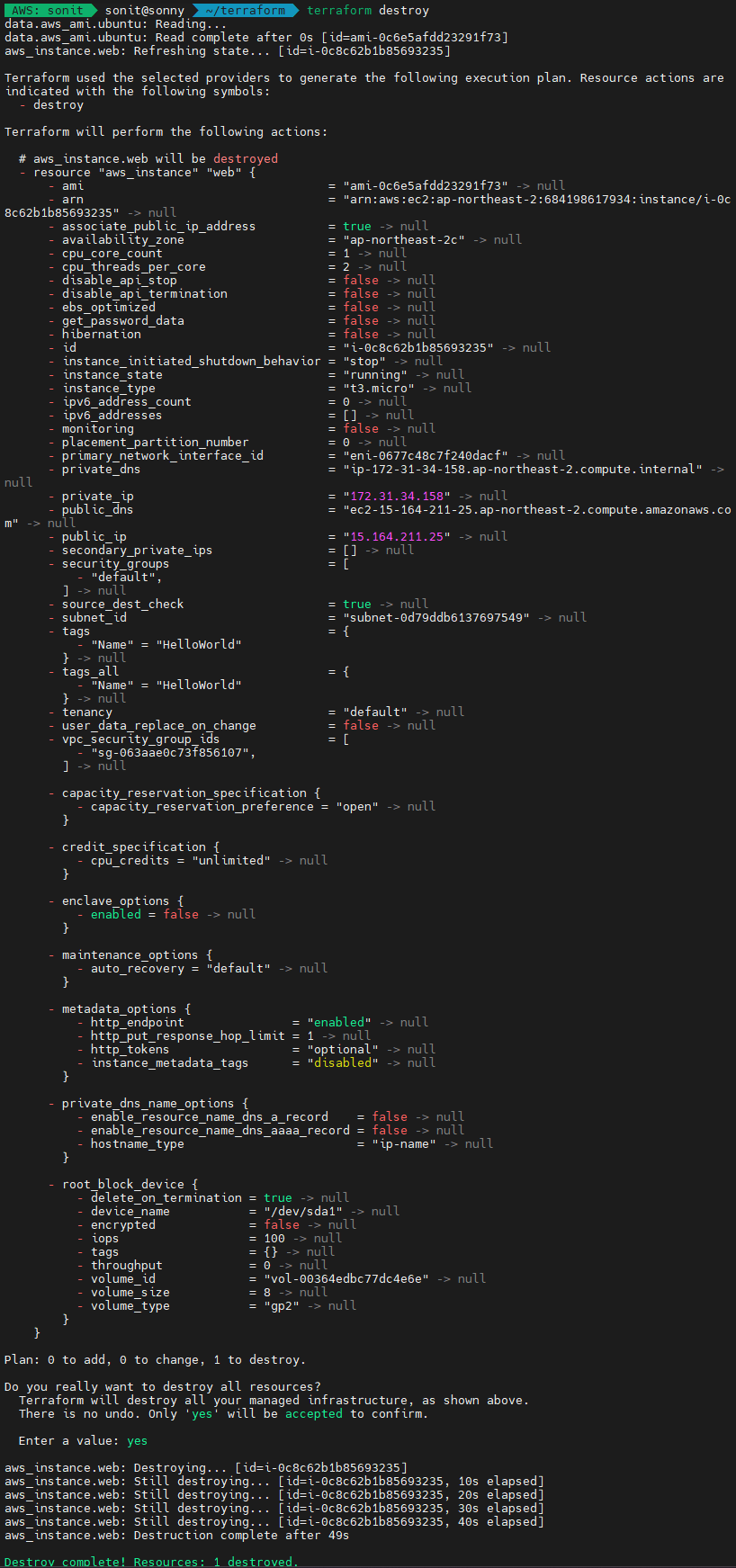 마지막으로 terraform destroy를 명령을 통해 앞서 terraform 코드를 기반으로 실제 인프라에 적용된 내용을 삭제할 수도 있습니다.