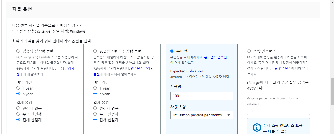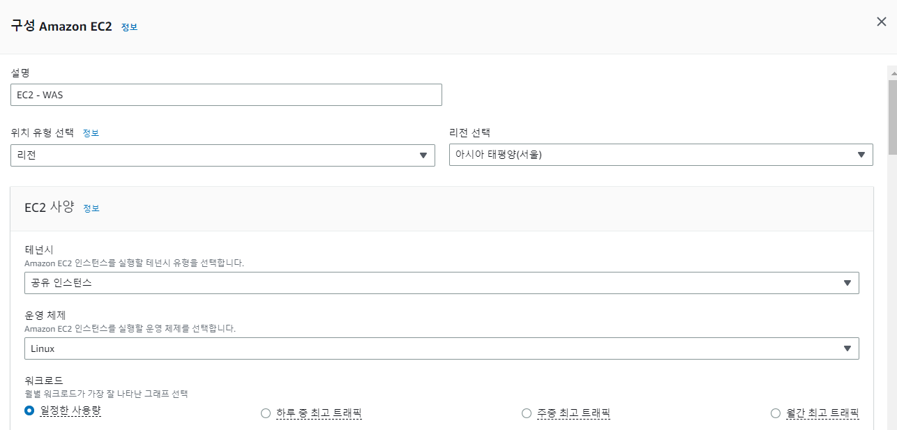 EC2 인스턴스의 인스턴스 유형, 인스턴스 개수, 운영 체제 등을 선택하고 구성을 조정할 수 있습니다. AWS Calculator는 다양한 서비스와 구성 옵션을 제공하므로, 예상 비용을 정확하게 계산하기 위해 구성을 정확하게 입력해주어야 합니다.