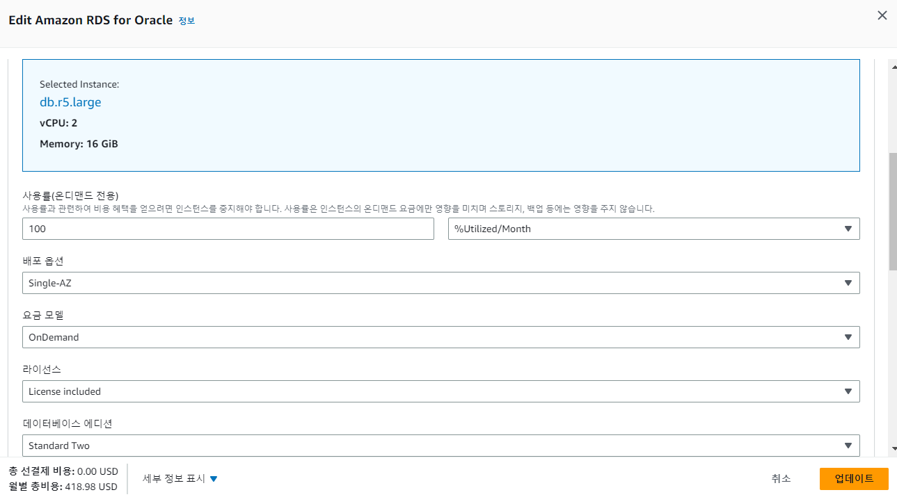 여기서 RDS 스펙의 예시로는 [그림 7]과 같이 db.r5.large , Single-AZ , License included 를 선택하였습니다.