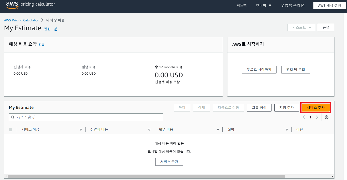 해당 사이트에 접속하면 사용할 서비스들에 대한 예상 비용을 확인할 수 있는 대시보드가 나오고, 서비스 추가 버튼을 클릭하면 원하는 서비스를 선택할 수 있는 화면이 나옵니다.