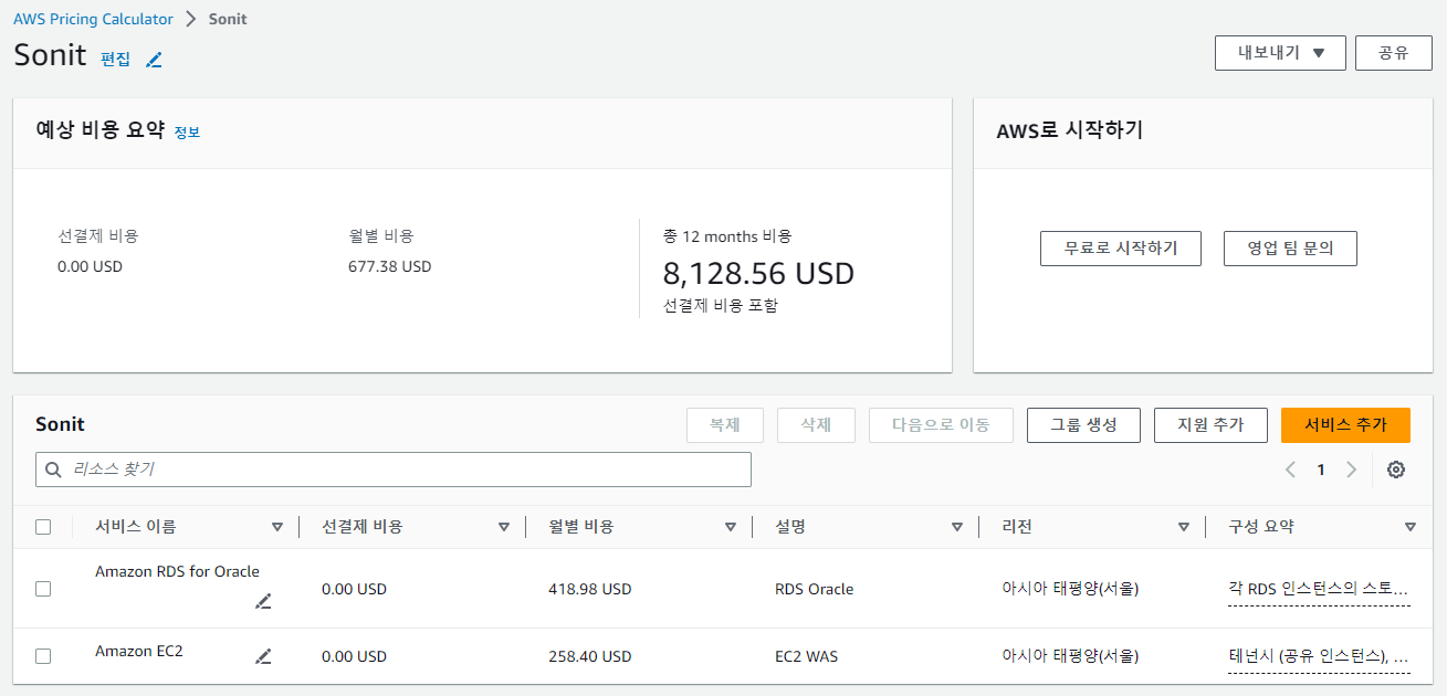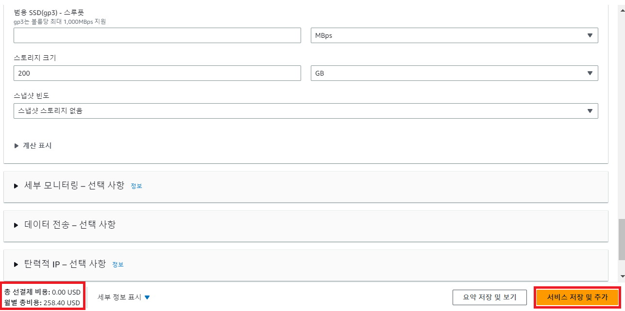 구성들을 모두 선택하고 맨 하단에 내려오면 해당 서비스의 예상 월별 비용이 보여지고, 서비스 저장 및 추가 버튼을 누르면 정상적으로 서비스가 추가되는 것을 확인할 수 있습니다.