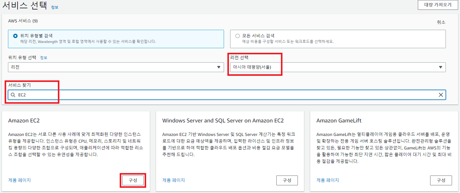 사용할 리전 과 사용할 서비스 를 선택하여 다음 화면으로 넘어갑니다. 여기서는 EC2를 예시로 들겠습니다. EC2를 선택하여 다음 [그림 3] ~ [그림 6]과 같이 EC2의 사양 과 유형 , 비용 지불 옵션 , 선택사항 등의 서비스 옵션을 선택하겠습니다.