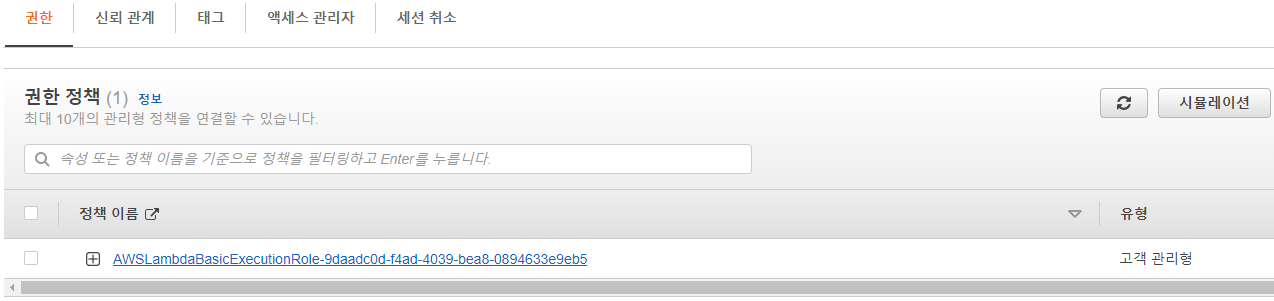 이대로 Deploy를 누르고 Test를 하면 Lambda에서 Instance와 RDS의 상태를 변경할 권한이 없어 실패할 것 입니다. 기본적으로 CloudWatch Log를 남기는 권한만 있는데, 구성 > 권한으로 이동하여 역할 이름을 눌러봅시다.