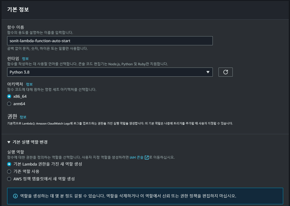 원하는 함수 이름을 입력하고, 역할은 우선 새 역할을 생성하는 것을 선택하고 넘어가겠습니다.