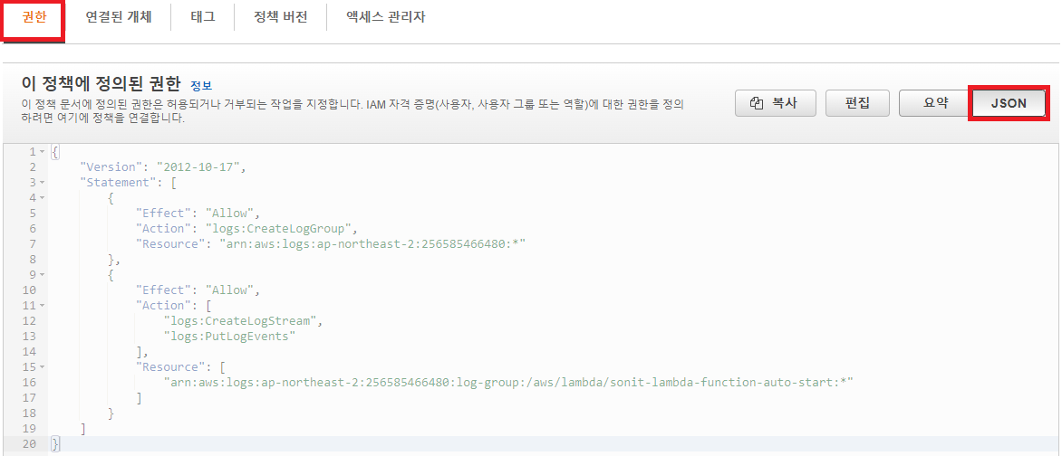 Lambda 권한을 위한 정책의 json은 다음과 같이 입력합니다.