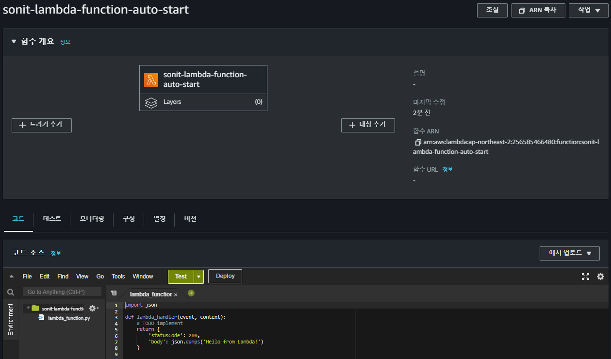 먼저, AWS 콘솔에서 EC2 인스턴스와 RDS를 자동으로 시작해주는Lambda에서 함수 생성을 눌러 함수를 생성합시다.