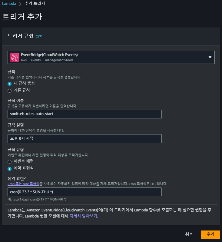 EventBridge의 예약 표현식은 cron(0 10 ? * MON-FRI *)으로 설정하여 오후 7시마다 auto-stop 람다가 실행되도록 설정합니다.
