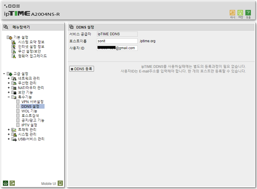 성공적으로 로그인하여 관리도구를 클릭하여 들어오고 나서 아래 [그림 3]과 같이 왼쪽 메뉴에서 고급 설정 - 특수기능 - DDNS 설정 메뉴에 접속하여 줍시다.