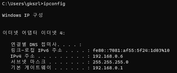 [그림 1] cmd에서 ipconfig 명령 수행 화면