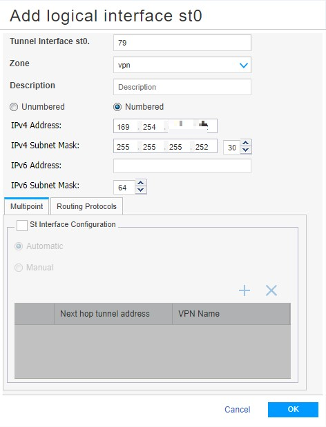 마찬가지로 구성 파일 내용에 있는 터널링 IP 대역을 그대로 입력하여 생성해주고, 여기서 인터페이스 번호는 st0.79입니다.