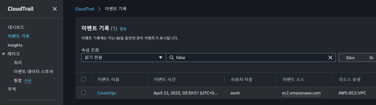 vpc를 생성하고나서 다시 CloudTrail의 이벤트 기록으로 돌아가보겠습니다.