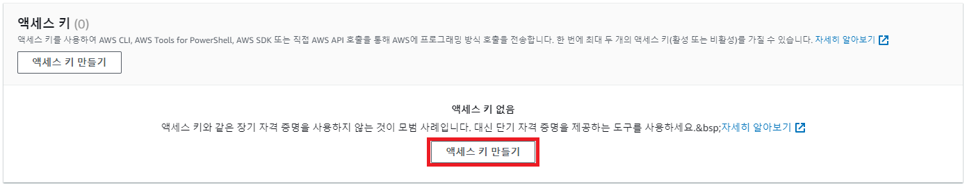 IAM > 보안 자격 증명에 접근하여 내려가다보면 다음 [그림 2]와 같이 엑세스 키를 만들 수 있는 화면이 나옵니다.