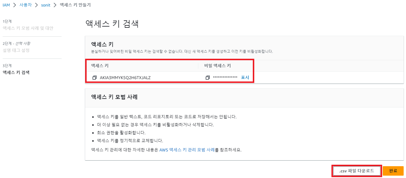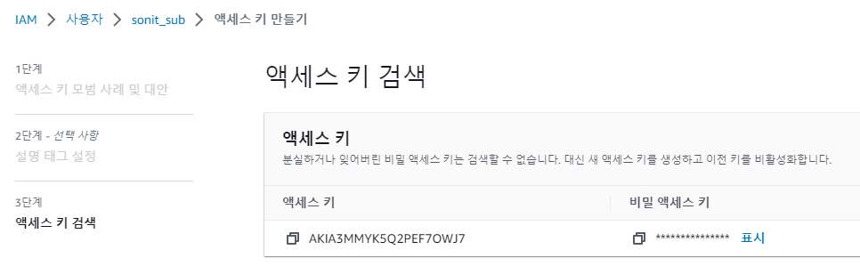[그림 4] 생성된 액세스 키, 비밀 액세스 키 확인