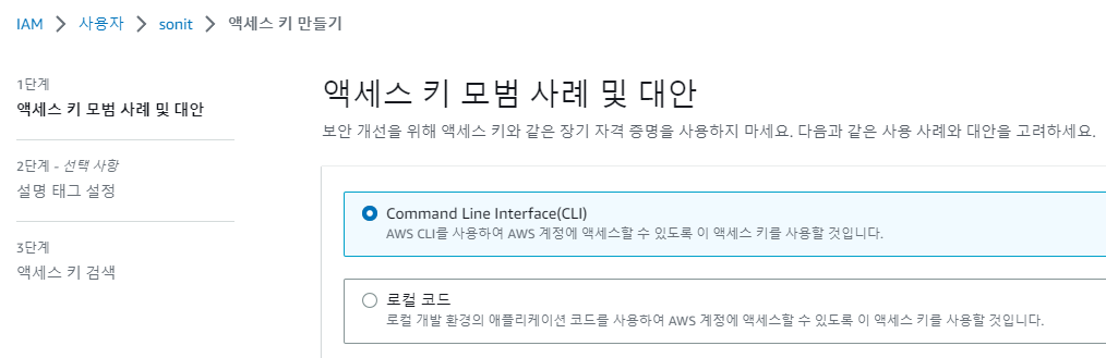 액세스 키 만들기 버튼을 누르고 CLI를 선택합니다.